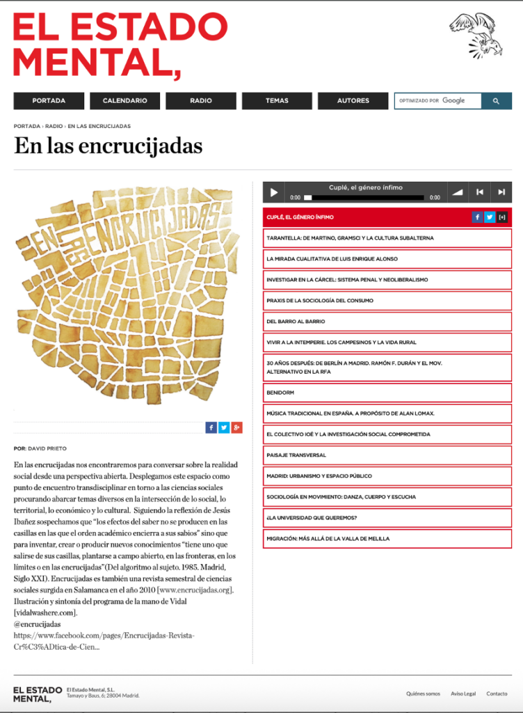 Con esta frase de Jesús Ibáñez se presentaba En las encrucijadas, un espacio radiofónico promovido por el colectivo editor de la revista crítica de ciencias sociales Encrucijadas: «un punto de encuentro transdisciplinar en torno a las ciencias sociales, procurando abarcar temas diversos en la intersección de lo social, lo territorial, lo económico y lo cultural» y «para conversar sobre la realidad social desde una perspectiva abierta.